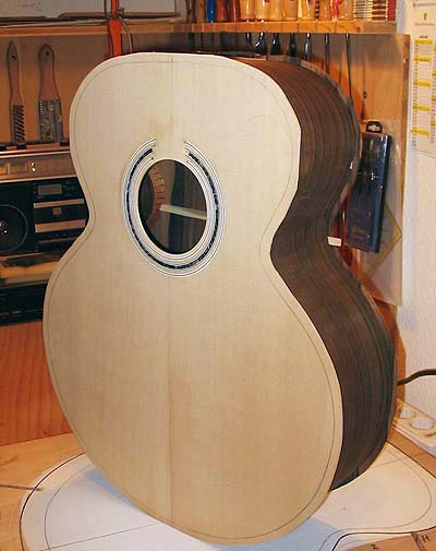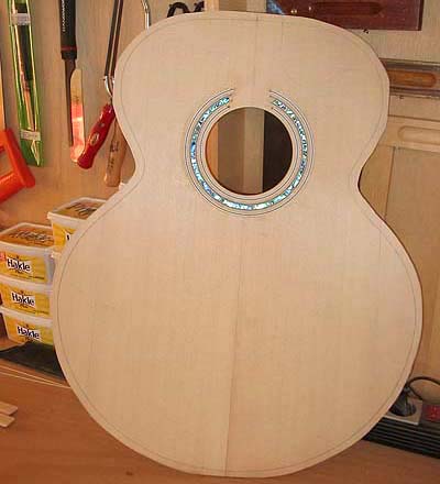 Paua Inlay work in the Soundhole Rosette Back sanded to proper thickness and trimmed |